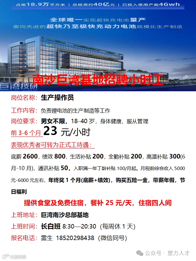 可预报名丨南沙巨湾总部基地丨长白班丨包吃包住丨男女不限丨生产操作员丨