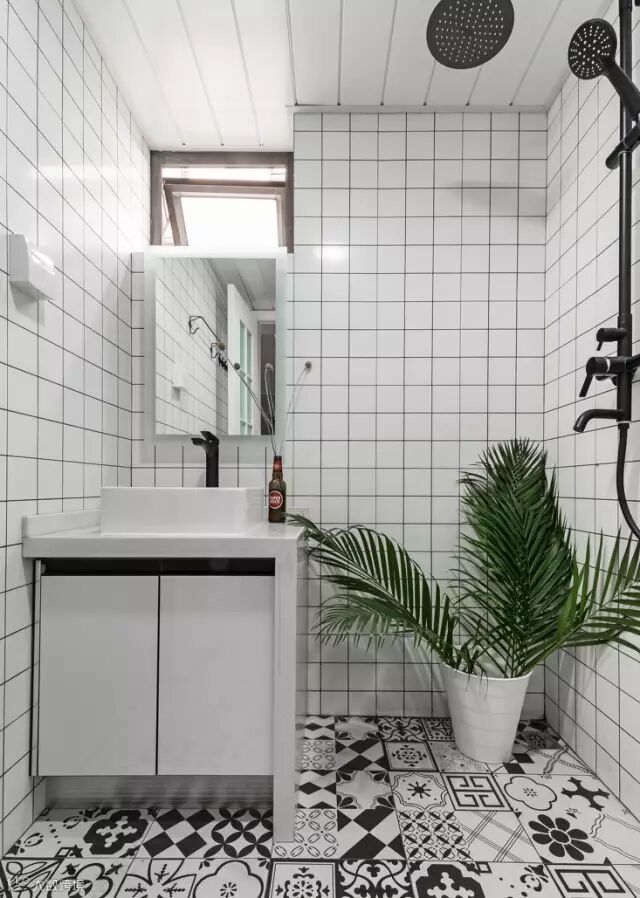 黑色的花洒与地面花砖遥相呼应,2平米的卫生间,个性十足。