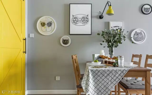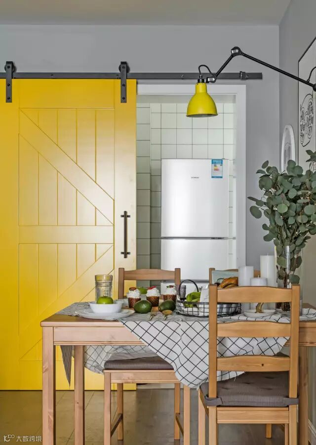 黄色谷仓门既节约使用空间,又增添了愉悦、欢快的氛围,与餐厅黄色壁灯遥相呼应,轻松、活泼。