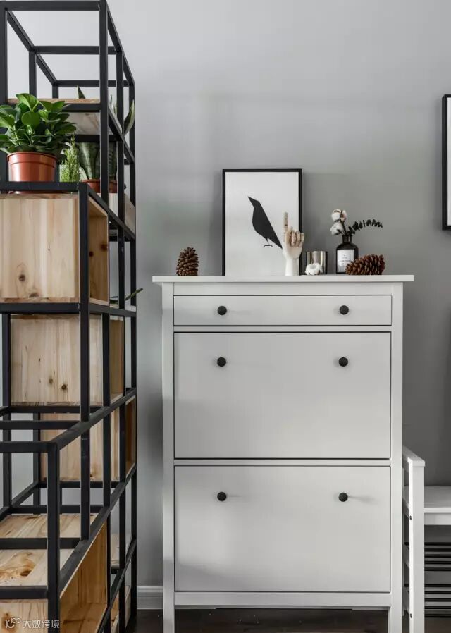 进大门右侧,正对餐厅区是鞋柜区域,业主独居,这款小鞋柜已经足够实用。鞋柜旁边是镂空钢木隔断架,它既起到了玄关柜的左右,又起到展示作用。