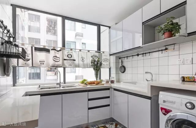 厨房采用白色调为主色,搭配花砖,整个空间清爽活泼,现在洗菜盆区域是以前的生活阳台,归入厨房后整个空间有效利用率更大,橱柜操作台面更充裕。
