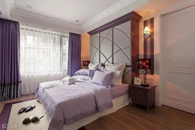 次卧用了紫罗兰基调,表现出温馨又神秘的感觉。