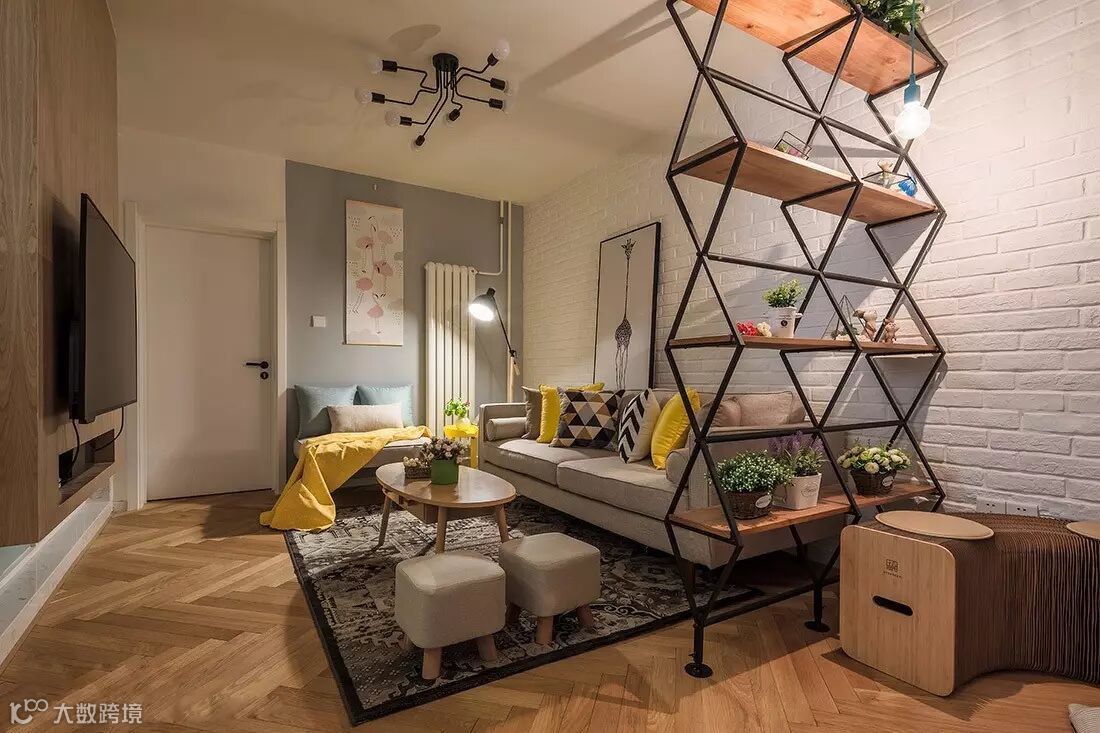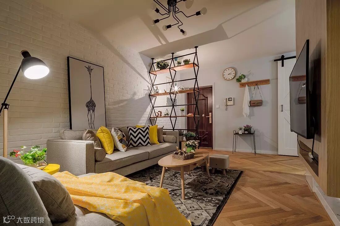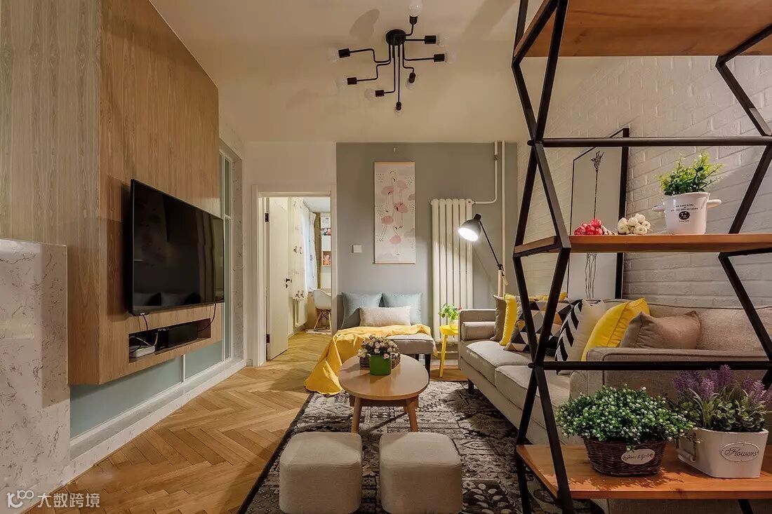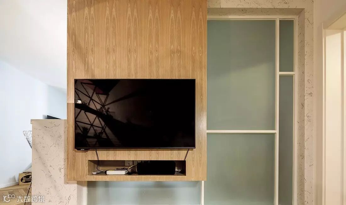 ▲客厅空间不大,电视墙很特别,用木头装饰,立体感十足。同时地板的铺贴也很有纹理哦~