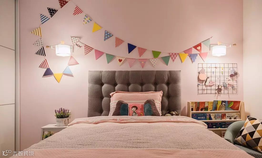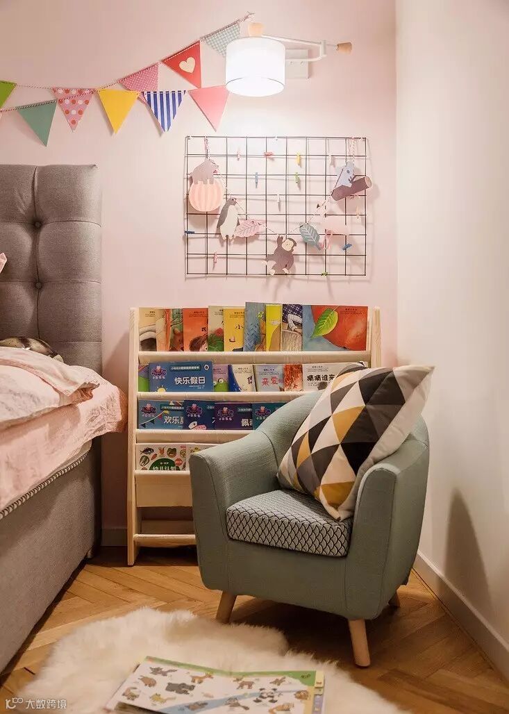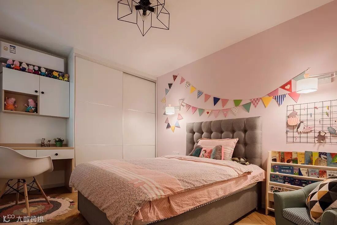 ▲依旧是出于节省空间考虑,选择了衣柜与书桌柜一体的设计。粉色墙壁的彩旗装饰以及铁网格点缀,一定是孩子最喜欢的地方了。