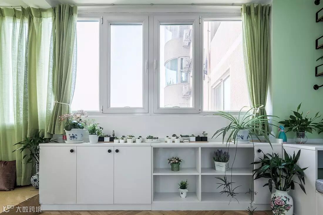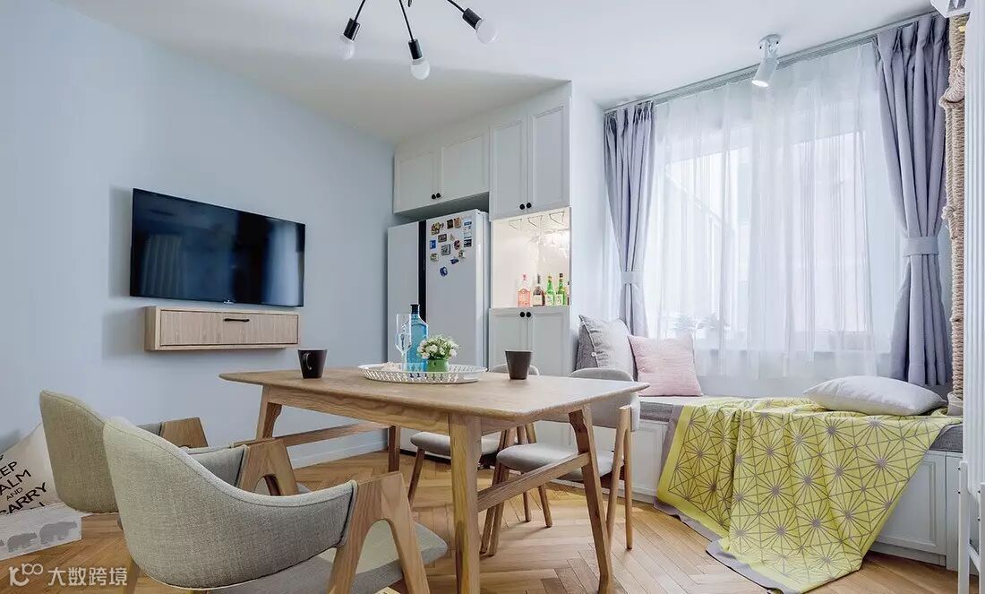 ▲冰箱与柜体合为一体,相当节省空间。靠窗的地方的做了个榻榻米,等饭之余,靠着读几页书也是挺不错的。