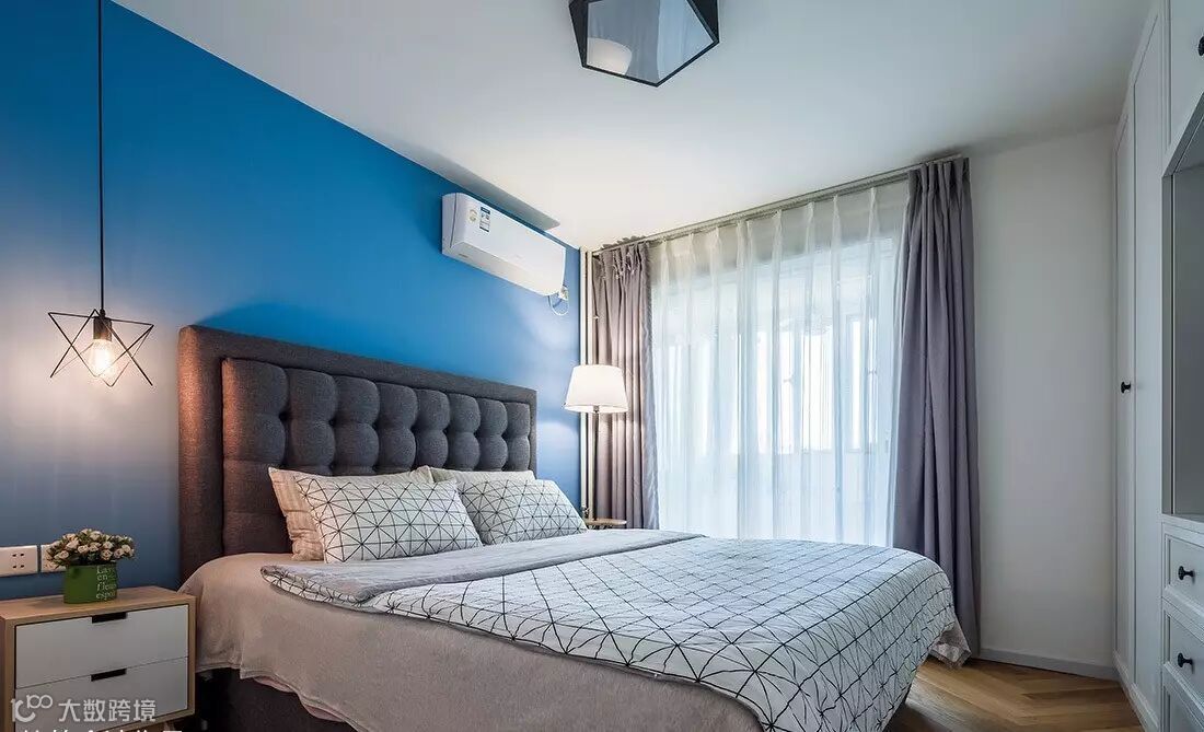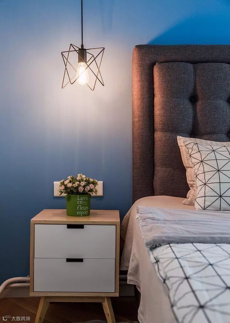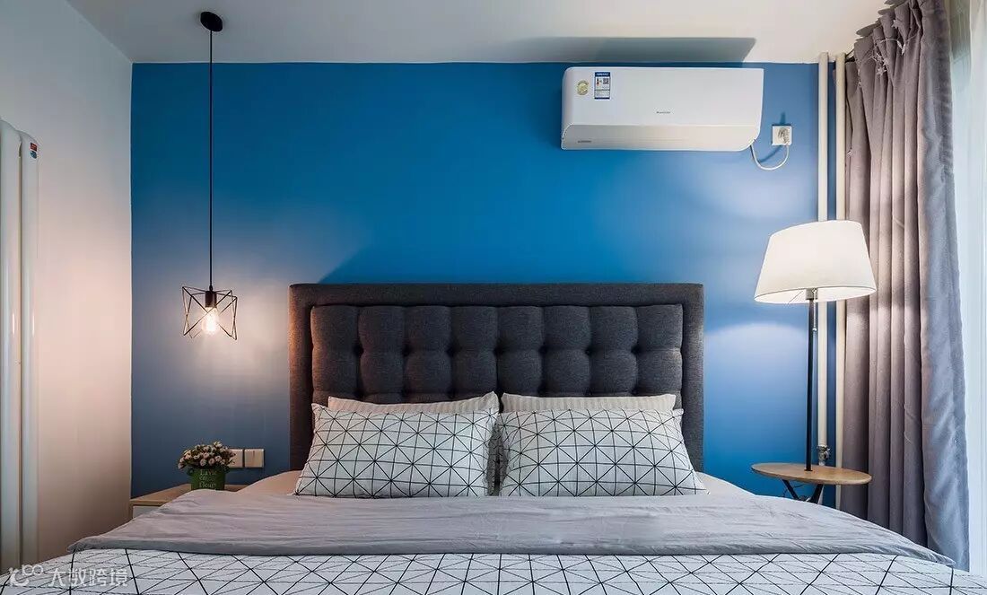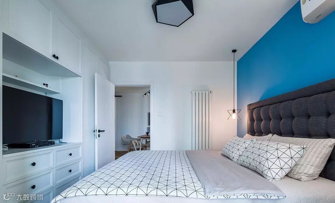 ▲色调方面,采用大面积的白色色调,配搭床头深蓝背景,蓝白对比,增添明亮清爽感。