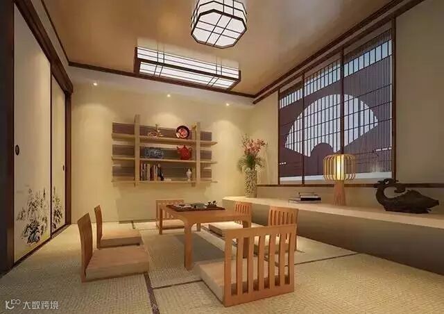 以色彩淡雅、简单明了的设计为主,搭配实木地板或榻榻米,一张小木桌、几个软靠,再加上明亮的落地窗、特色的小摆件,满满的文艺范。别具一格的日式茶室装饰上更为简便灵活,可自主搭配。