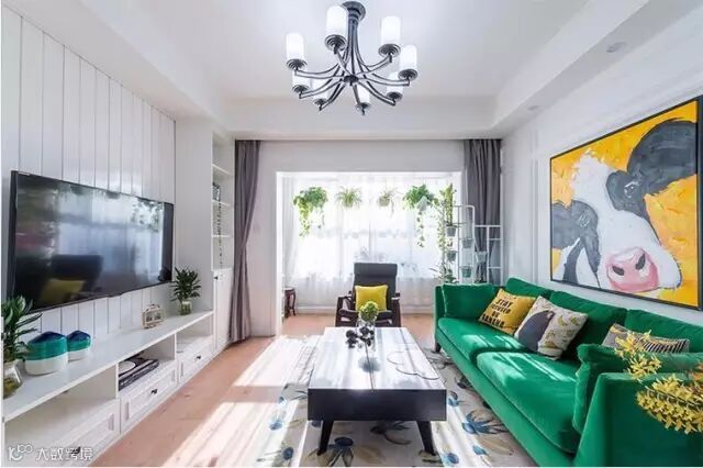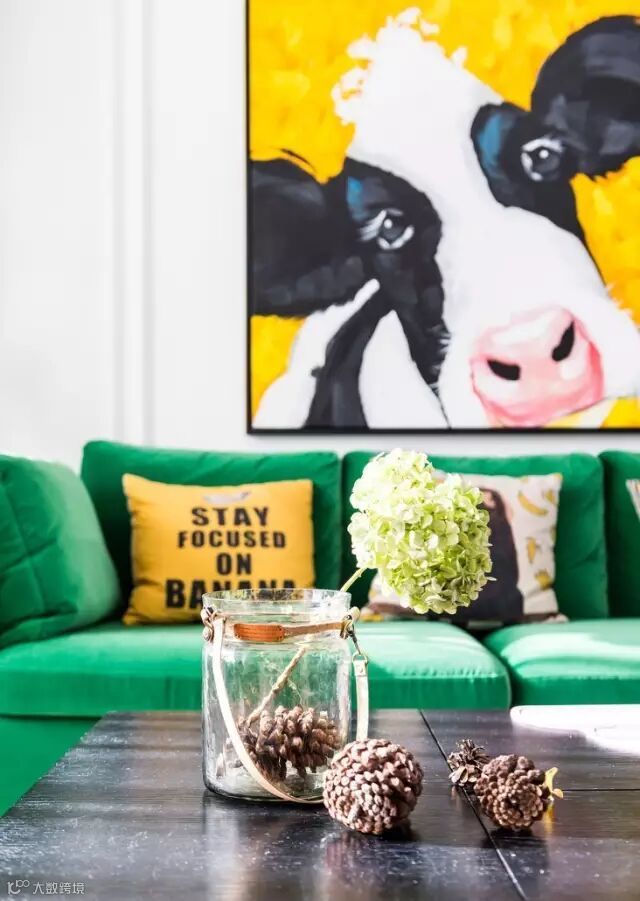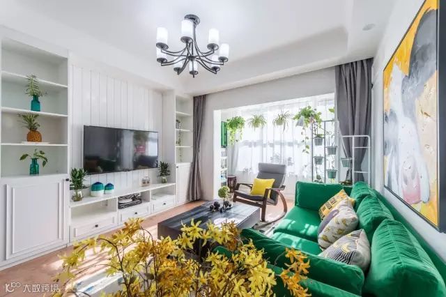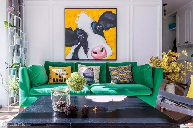 这个不大的房子以明快简洁为硬装基调,装修格局开放而舒适。绿色的沙发与黄色的植物和挂画形成鲜明跳跃的对比,使空间更加灵动,充满活力。