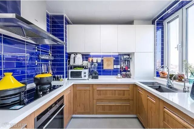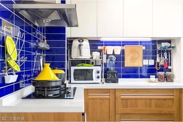 厨房的冰蓝色绝对是与众不同的存在,与原木的橱柜搭配似乎有那么一点不和谐,但是远不及那份狂野来的有意义。蓝色与整体白色相互映衬,更显纯粹洁净。