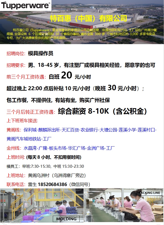 模具操作工丨特百惠(中国)有限公司丨黄阁美资企业丨男18-45岁丨包工作餐丨购买广州社保
