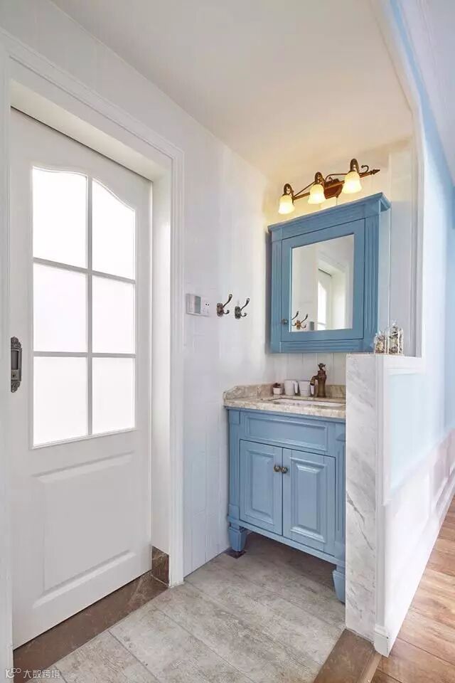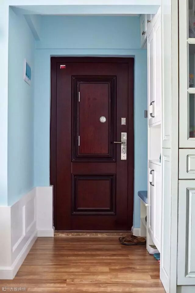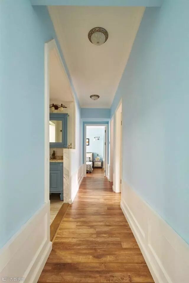 刚进门的左边就是玄关柜子,分为上下两排,可以放包和鞋子,柜子是白色的,和蓝色的壁面搭配在一起很协调。