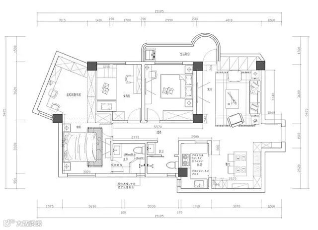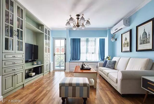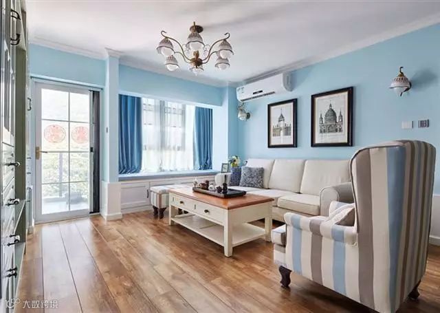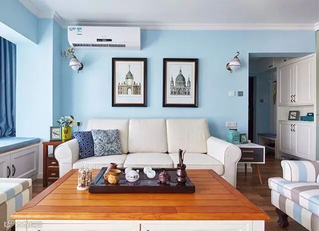 蓝白的色调,条纹沙发,有地中海风格的清新浪漫感。