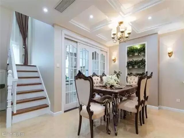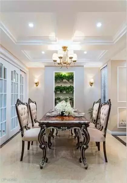 吃饭地方比较注意重点照明,十字型吊顶设计正好搭配欧式吊灯形成照明聚焦点