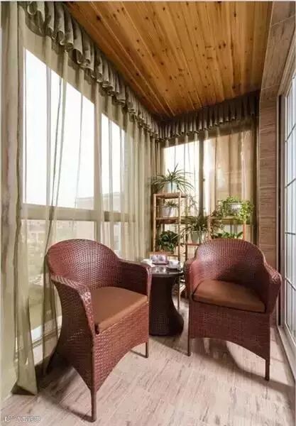 作为休闲的空间阳台采用木板吊顶,点缀上花架绿植更有身在自然圈子的感觉