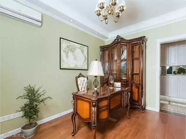 布置的简洁舒适,浅绿色墙面十分护眼,一套欧式的书房家具不失典雅格调