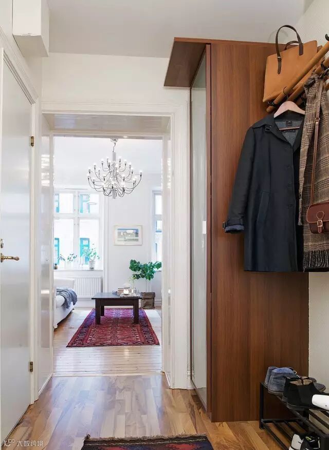 ▲在鞋柜一旁摆放一个穿衣镜,后面打造出一个小的衣帽间,空间利用率极高。