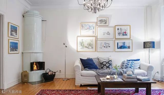 ▲靠近墙角处放一个壁炉,很有情调;墙上的装饰画清新自然,与沙发正好形成相映,最喜欢那个蓝色的落地灯,显出独特的格调。