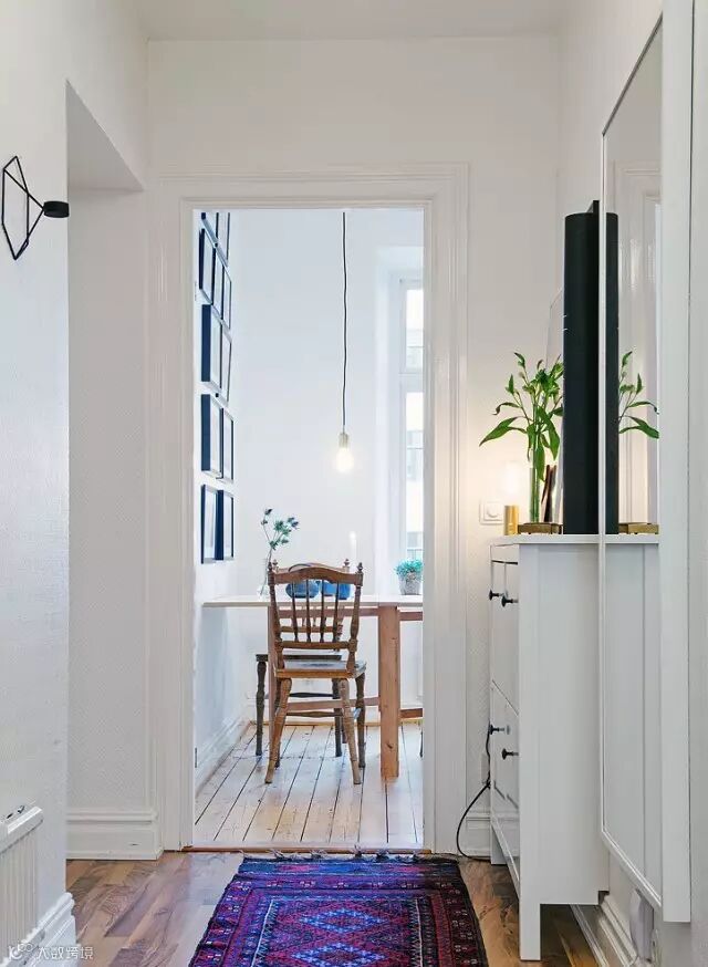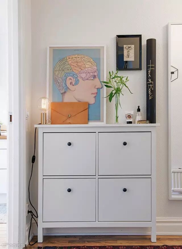 ▲入门处放置一个白色鞋柜,上面放上两幅装饰画,搭配绿植,很有艺术文化感。