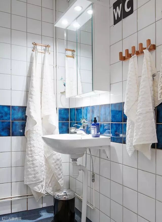 ▲白色的方格墙砖穿插蓝色墙壁,避免了颜色的单调和冷淡。立柱体洗脸池,上面设置浴室柜,增加收纳功能。