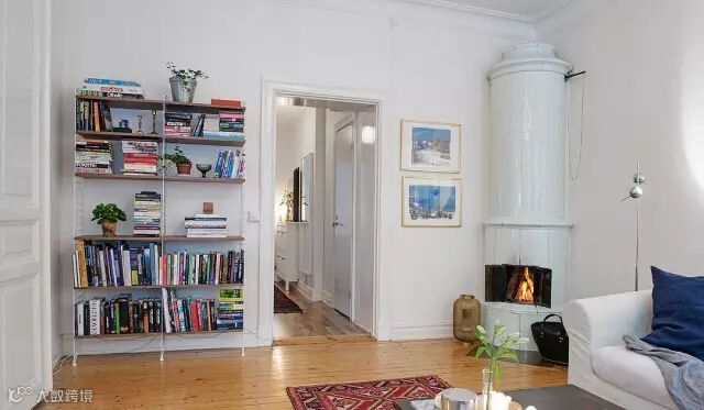 ▲墙角壁炉的火苗跳动着,与之一条线上的则是简易的书架,一动一静,窝在沙发上享受这动静,恰是惬意。