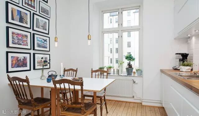 ▲餐厅兼厨房设计,开放式设计,简单实用,窗台上的绿植点缀出自然,背景墙上的装饰画层次分明,使得餐厅厨房一体更具饱满感。