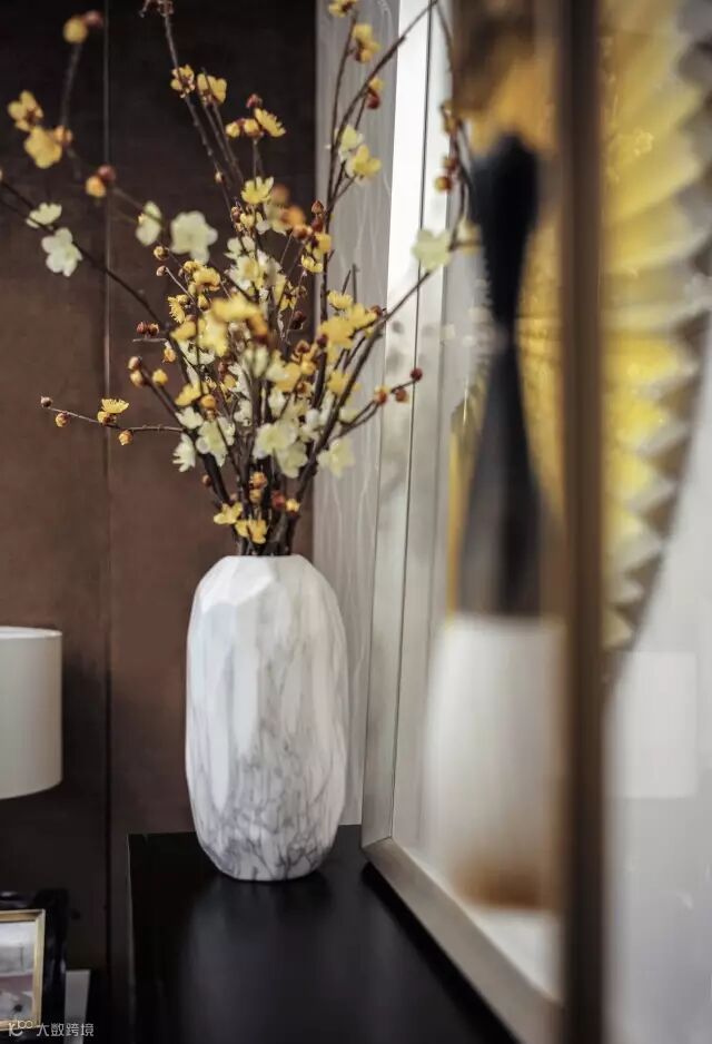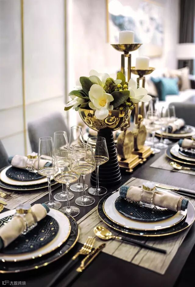 餐厅的设计上注重就餐氛围的营造,高级灰软包面料的餐椅,围合着深色餐桌,深浅不一的颜色搭配,调和出空间的层次感,精致的餐具,以及带点中式意境的花艺,显示主人的高雅品味。