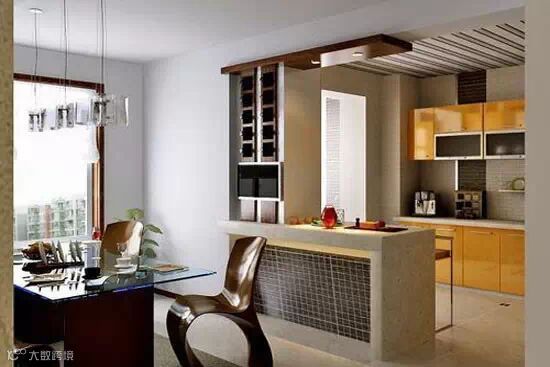 有些开放式厨房也与客厅相连,在厨房外侧做一个造型简单大方的吧台隔断,或者放置一个酒柜,也不失为一种经济实用的设计。吧台或酒柜作为客厅和厨房、厨房和餐厅的隔断,效果十分显著。