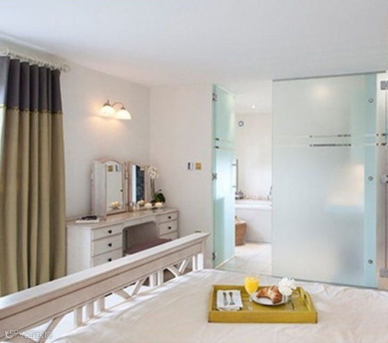 玻璃也是一种常见隔断,玻璃品种繁多,有普通玻璃、磨砂玻璃、彩绘玻璃等,而且通透性与装饰效果突出,在光的作用下色彩有变化,且价格适中,所以在隔断中运用非常普遍。其中用玻璃门作为卧室和卫浴间的隔断,可以避免木门或铁门带来的沉重感,显得更为轻巧,装饰性也更强,磨砂的玻璃也不至于让你在洗澡的时候“春光外泄”。
