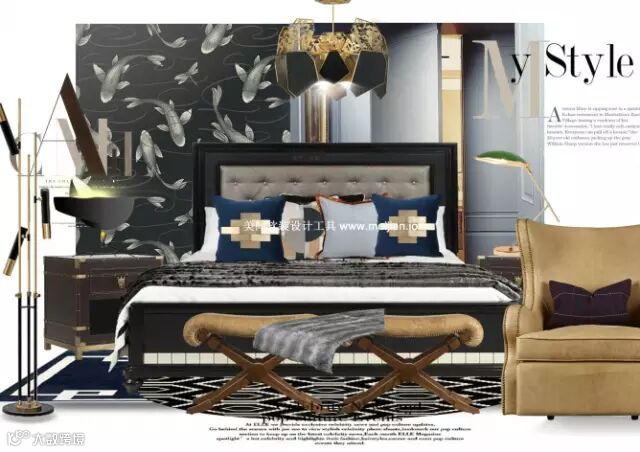 别以为绅士对卧室的搭配就会放松,他们无时无刻都在透露出自己不会随遇而安的性格。比如这套卧室的软装搭配,就非常符合他们考究细致的性格。这里安静、内敛也不失生活的灵动。鲤鱼图案的黑色壁纸让空间沉稳不失趣味,端正挺拔的双人床让人沉静的休养,复古金属床头柜、质感皮沙发,充满了品味和气度,还有默默发光的精致灯具,柔软的布艺,这些都营造出了情节流转的绅士情怀。
