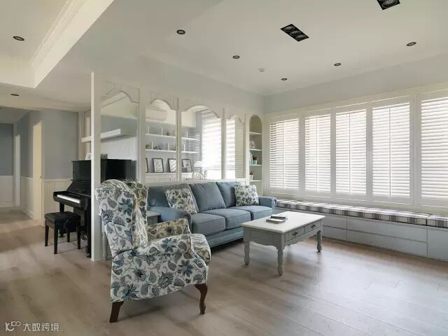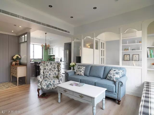 半开放的隔断墙设计很新颖别致,护墙板式的设计加上拱形样式,沙发包边镶嵌的小铜钉,到处都洋溢着浓浓的美式风情调,在美丽的外表下也有非常实用的收纳设计,隔断墙右侧靠窗部位设置了一个内嵌式的收纳小侧柜,可以随意的摆放一些杂物,摆点小装饰品也是美的。