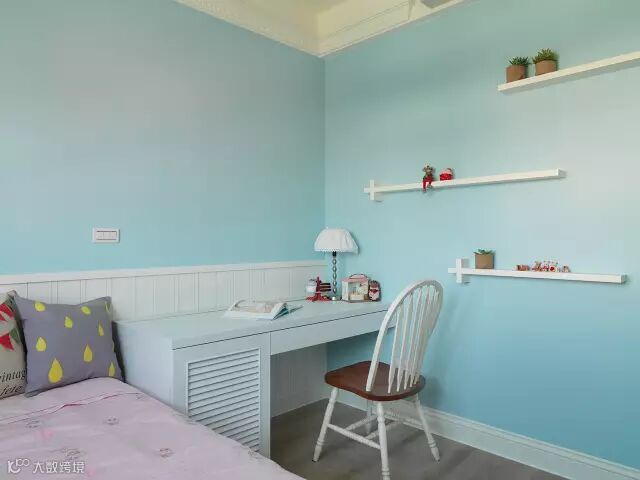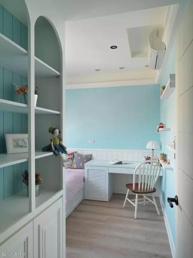 次卧:一看就知道是孩子的房间,蓝色和粉色的马卡龙颜色搭配,带来童趣的梦幻色彩,墙上的收纳横板也是可以摆放一些孩子的玩具和杂物,白色护墙板清新干净。