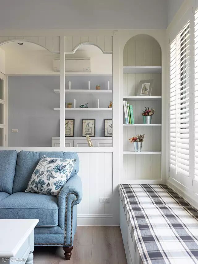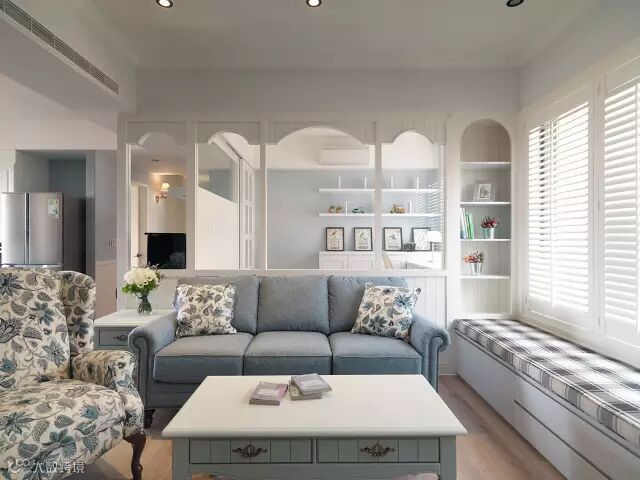 客厅:奶蓝色加上白色,这浅色系的配色给人带来非常清新又温柔的感觉,让居住空间的温暖氛围瞬间提升好几个级。再注意沙发的装饰,搭配以小碎花相间的布艺沙发,干干净净的小清新味道。长长的飘窗区域也是铺了蓝白格子软垫,与整体氛围非常搭调。