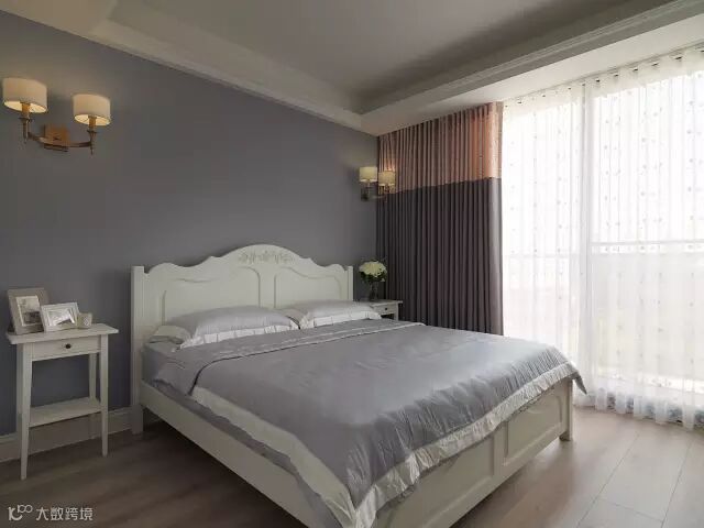 卧室:看得出来,设计师是要将温柔温馨进行到底了,卧室的颜色也是选用低饱和度的颜色,淡淡的紫罗兰色成功的把卧室的睡眠氛围蒙上了一层梦幻的浪漫味道。简约的家具,但雕刻细节确实十分精美,再加上如此棒的采光,觉美轮美奂的休息空间,将卧室放松身心的功能定位诠释的完美无缺。