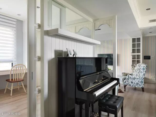 一面带拉门的可调节隔断墙隔开书房,餐厅和客厅的区域,而在此处摆放一台钢琴,更是可以给空间增添一些艺术气息和小资的生活情调。