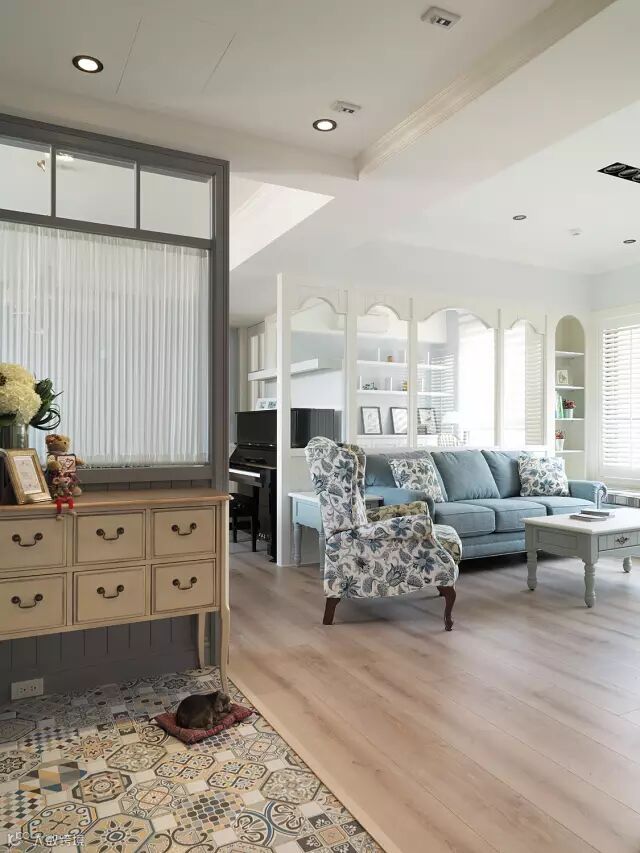 女主非常喜欢各类的马赛克文化砖,因此自己挑选的瓷砖样式的时候跑了很多家店挑到的这片精美的磁珠,的确,辛苦总归没有白费,因为这片瓷砖简直是美极了。既文艺又和整体的色调蓝白灰十分协调,相映之下,让空间更加的精致细腻。大家在装修选材的时候也要学会颜色上的搭配,仔细看瓷砖,为何如此多的花纹罗列却没有显得空间很凌乱,因为瓷砖上出现的颜色都是空间里面存在的协调色,黄色和边柜与地板一致,白色和蓝色与空间的墙面与沙发柜子等软装一致。