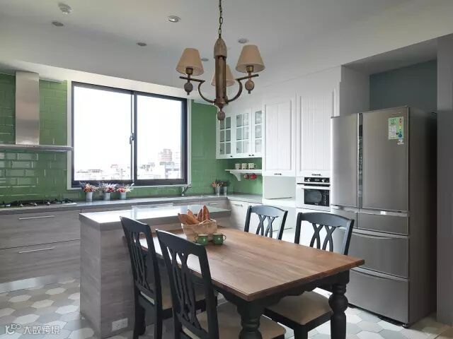 厨房:开放式的设计让厨房和用餐区域非常明亮通透。中岛台隔开做饭和用餐的区域,在全开放中进行了简单的划分。绿色的墙砖和木质的餐桌搭配看起来文艺又复古,质感满满。冰箱放置在内凹的墙体里,节省空间。向上看,头顶的吊灯也很有美式风的复古情怀。