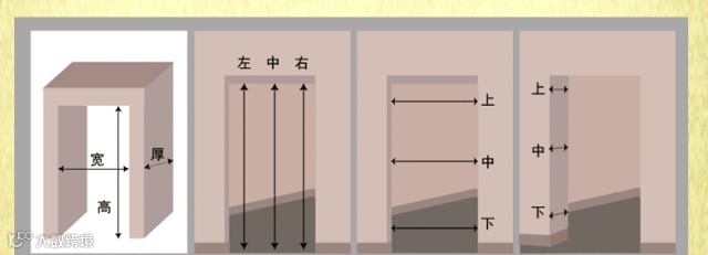 1)门洞高度的测量,用皮尺按图示从贴磁砖的表面或预贴磁砖水平线位置量至门洞的最高处,量测三次算出平均值作为门洞的高。
