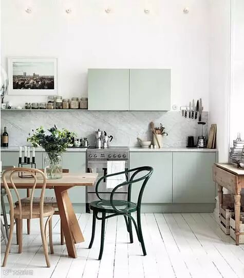 日式厨房一般都能给人带来一种清新的感觉,在木质元素的基础上以清新的色系来释放出日式厨房的本质,就是这间厨房的重点所在了。没有太过鲜艳的颜色,选用了浅浅的灰绿色调作为橱柜的主色,墙面上低调的浅花色纹理瓷砖仿佛都能融入橱柜色系之中,整个厨房感觉就是淡雅脱俗。