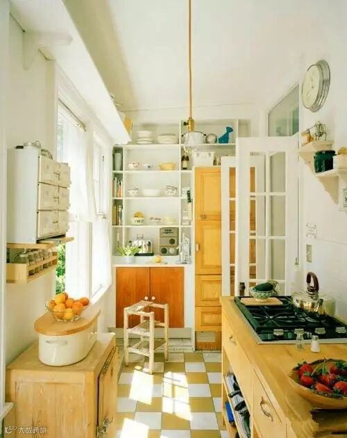 相比上一款,这款可能是现在年轻人更钟爱的,浅色的木质橱柜与白色墙面的结合使整个空间都有种日式小清新的感觉,黄白相间的方格子地砖也让厨房的整个气氛活跃起来,在墙壁上大量运用了储物格的设计,充分的利用了墙面空间来达成收纳效果。