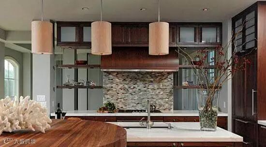 在空间里运用较深色系的木质作为厨房主色调,可以使整个厨房空间显得沉稳,从而在不经意间提升了整个空间的质感度。三盏并排的圆筒形吊灯突出了厨房空间的温馨感,木质橱柜与白色大理石台面组成了这一空间,灶台处的背景墙采用素色马赛克墙面,增加了厨房空间的灵动感。