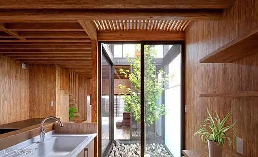 全木质的厨房空间,总会给人一种很原生态的感觉。横条镂空木质顶部的设计使厨房的采光与透气感都有所提升。而白色台面与水槽更是突出了整间厨房的简约个性。