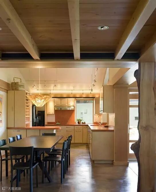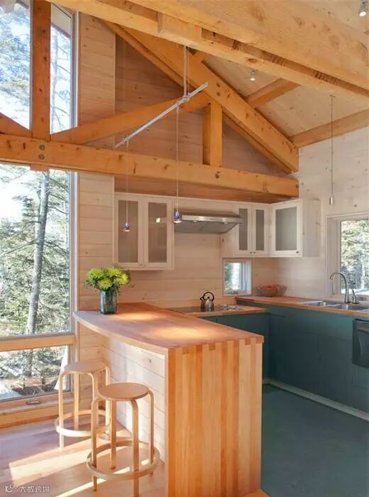 挑高式的空间,以原木色为主的木质厨房,从橱柜台面一直延伸到吧台的设计使厨房的料理区域与用餐区域相结合,给了厨房一定的空间感,也使烹饪多了一份乐趣。