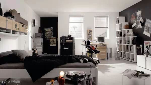 黑色是这个房间的主旋律,墙上的挂饰是点缀。整体感觉很酷,很能体现男孩子的风格。