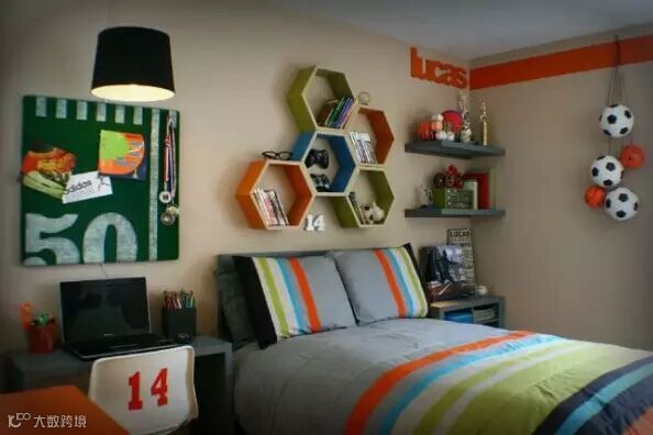 床头蜂窝形储物很有个性,右边挂着的足球也成了男孩子的标志性物品。