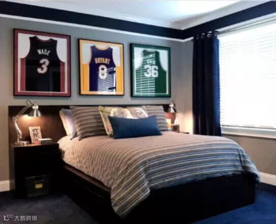 床头三幅挂画都是篮球服,透露出男孩子气概。所以,给你家的男孩设计房间时,运用一些与运动相关的元素。不过,前提是他喜欢的运动。