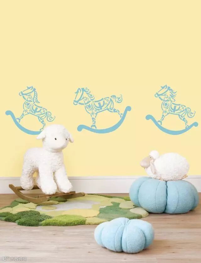 憨态可掬的三匹小摇马,从遥远的花都一路驰骋,俏皮地在孩子的屋墙上停下脚步,仿佛要邀请小宝贝们一起玩耍。宝宝蓝的马身和鹅黄色墙面相搭配新鲜水嫩,赋予儿童房童话般的浪漫氛围,给孩子们带来无限想象。