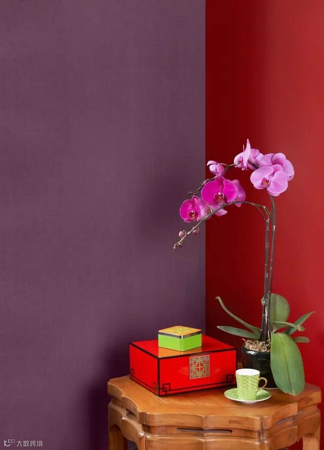 织物质感漆错落雅致的纹理明暗有致,为墙面平添一抹端庄与华贵。当温润知性的紫色邂逅主墙这抹奢华红,不仅将浓郁的红色进行平衡和中和,同时打造出一种渐变层次,让空间更为灵动婉约,打造一个时光交错的新上海摩登之梦。