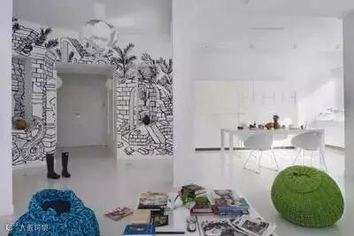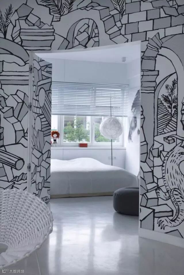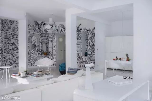 将这两大空间区隔开来的隔间墙上有着波兰艺术家Tymek Jezierski 的壁画创作,利用艺术作品来强调公寓的现代主义特征。