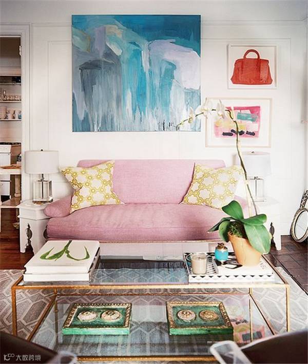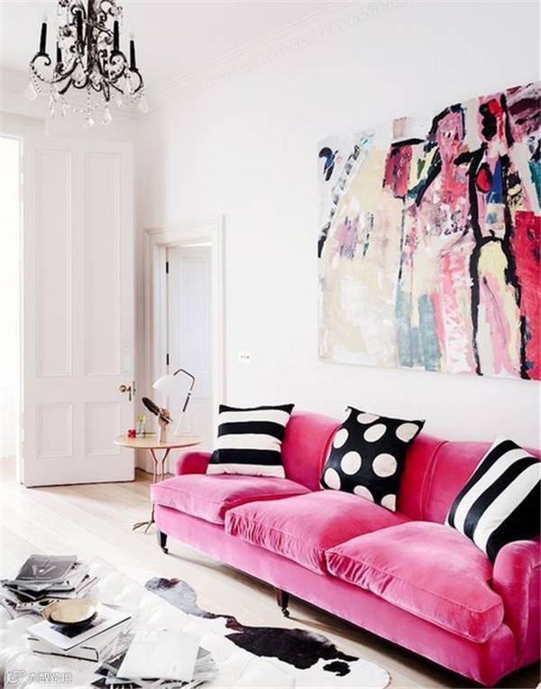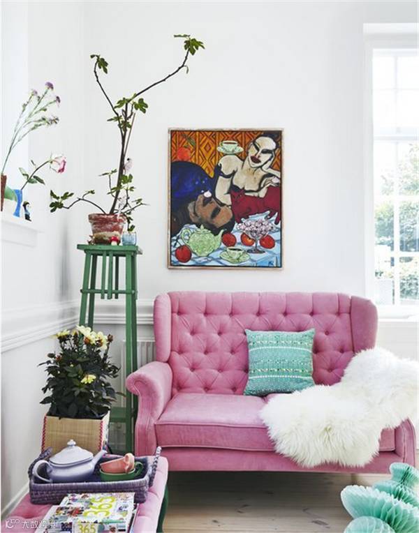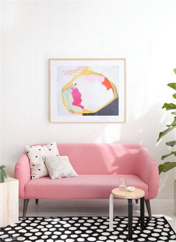 粉色象征甜美,纯真浪漫,温柔的色彩让人的心情得到舒缓和放松,粉色沙发配以白色背景墙与装饰画显得干净、明亮和温馨;与绿植相配更是提升了房间的层次感。