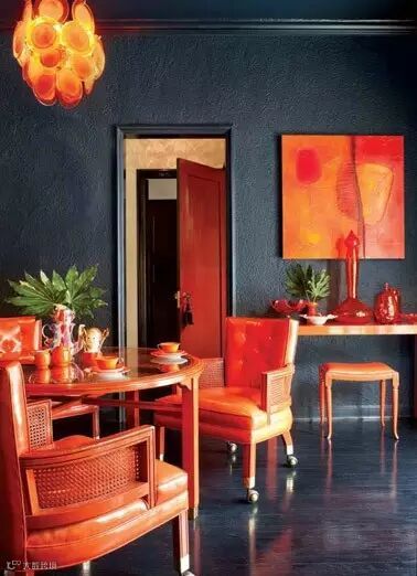 色调对比设计也是普遍采用的方式之一,往往是采用整体与局部色调对比法,在整个沉灰色的空间了,红橙色调的运用除了造成鲜明对比外,还缓和了单是沉灰色调所呈现出的压抑感,犹如黑夜中的一颗夜明珠,充满温暖与活力。
